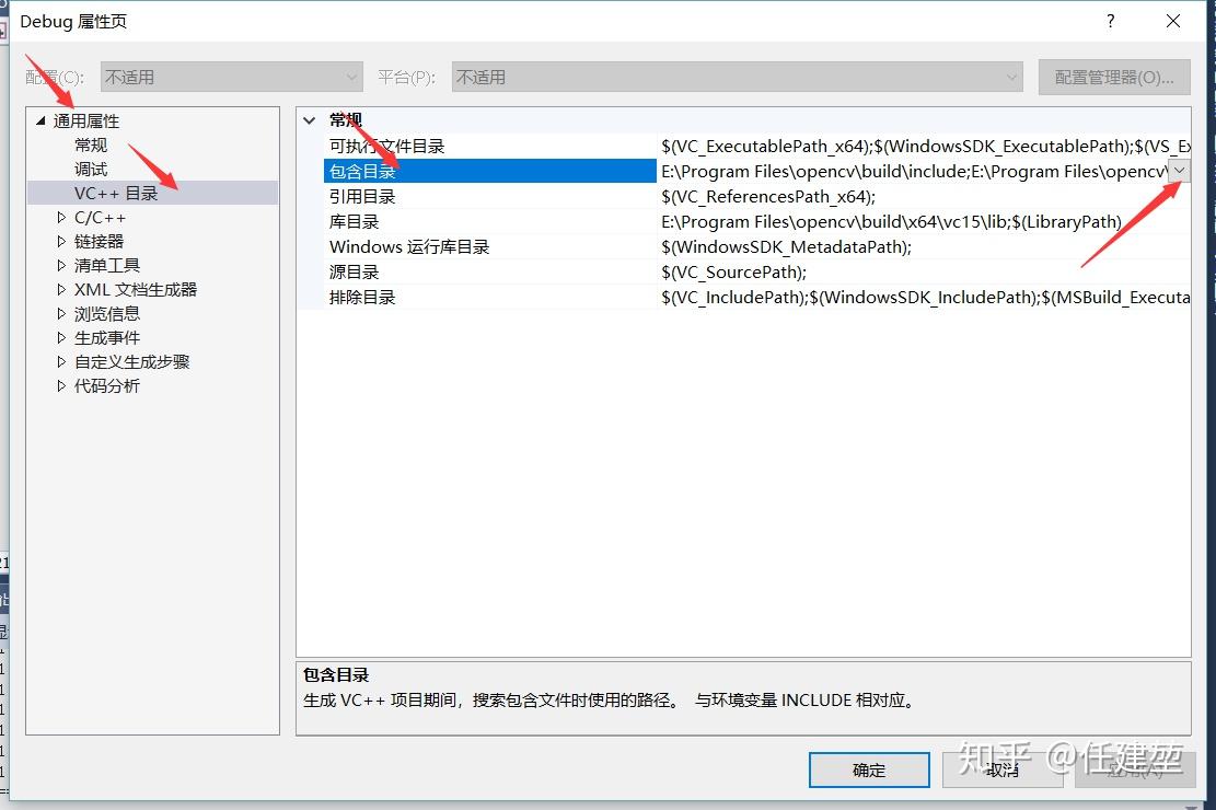 打开属性页面后在通用属性->vc++目录->包含目录中添加以下三个目录
