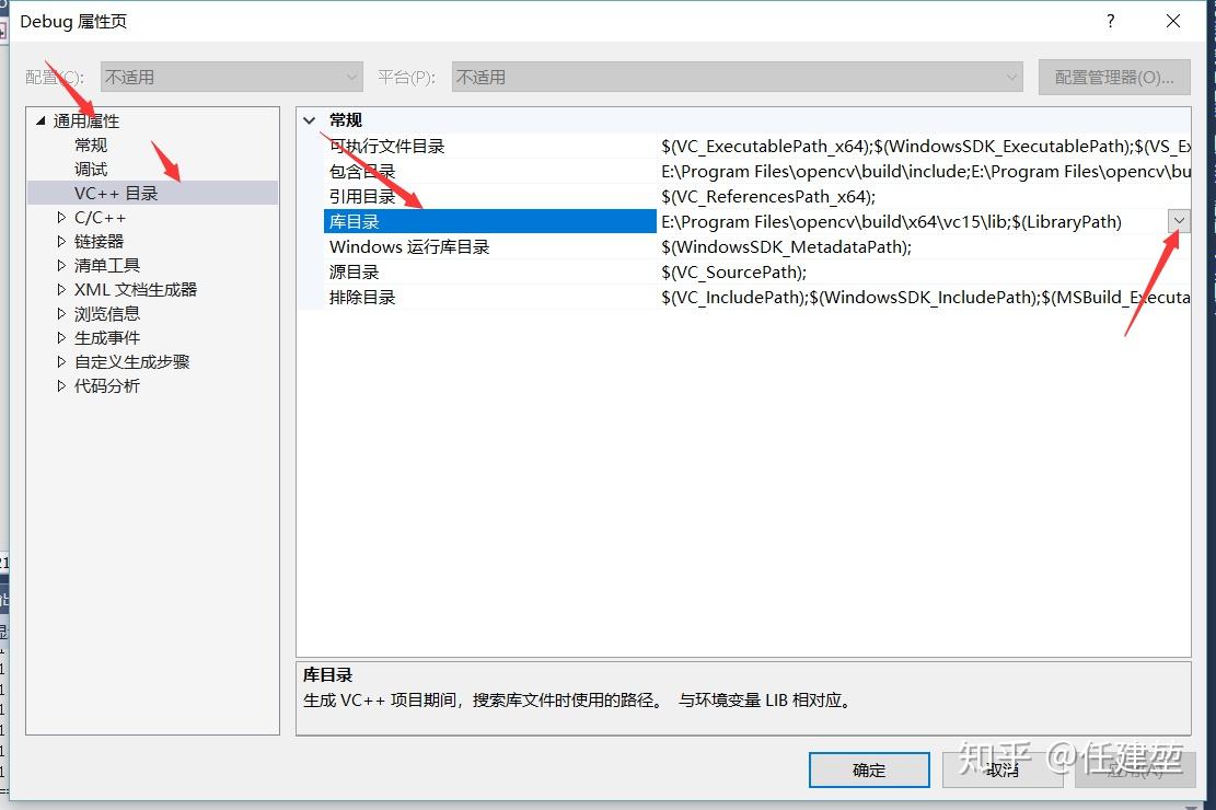 这一步也是在“属性管理器”工作区中,单击项目->【Debug|x64】(右键属性),在属性页面中选择通用属性->VC++目录->库目录添加路径