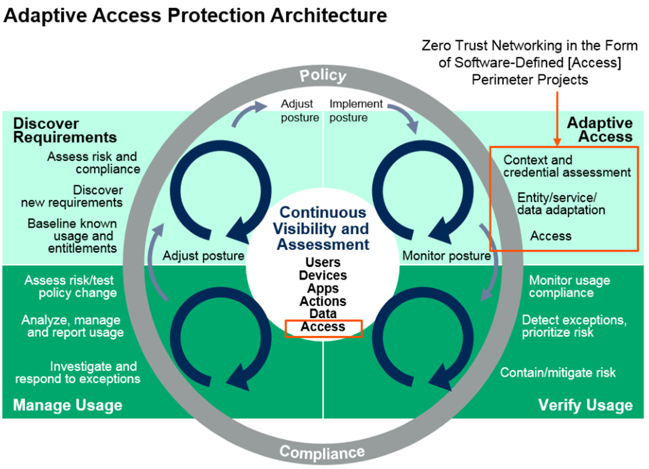 同样,在CARTA自适应的访问防护架构中,初始安全状态都是默认deny状态,如下图右上角的红框所示。在对用户的凭据、设备和上下文进行评估之前,用户没有任何访问权限。因此,在建立足够的信任级别之前,不应该授予访问权限。CARTA进一步扩展了零信任的概念,并将访问保护视为一个持续的风险和信任评估问题,如下图的深绿色部分所示。在图形的中心,CARTA还扩展了网络访问之外的功能。例如,CARTA战略方法监视用户的风险行为,即使他们已经通过了初始风险和信任评估,并被授予了对应用程序的访问权。这就是被称为用户和实体行为分析的UEBA。