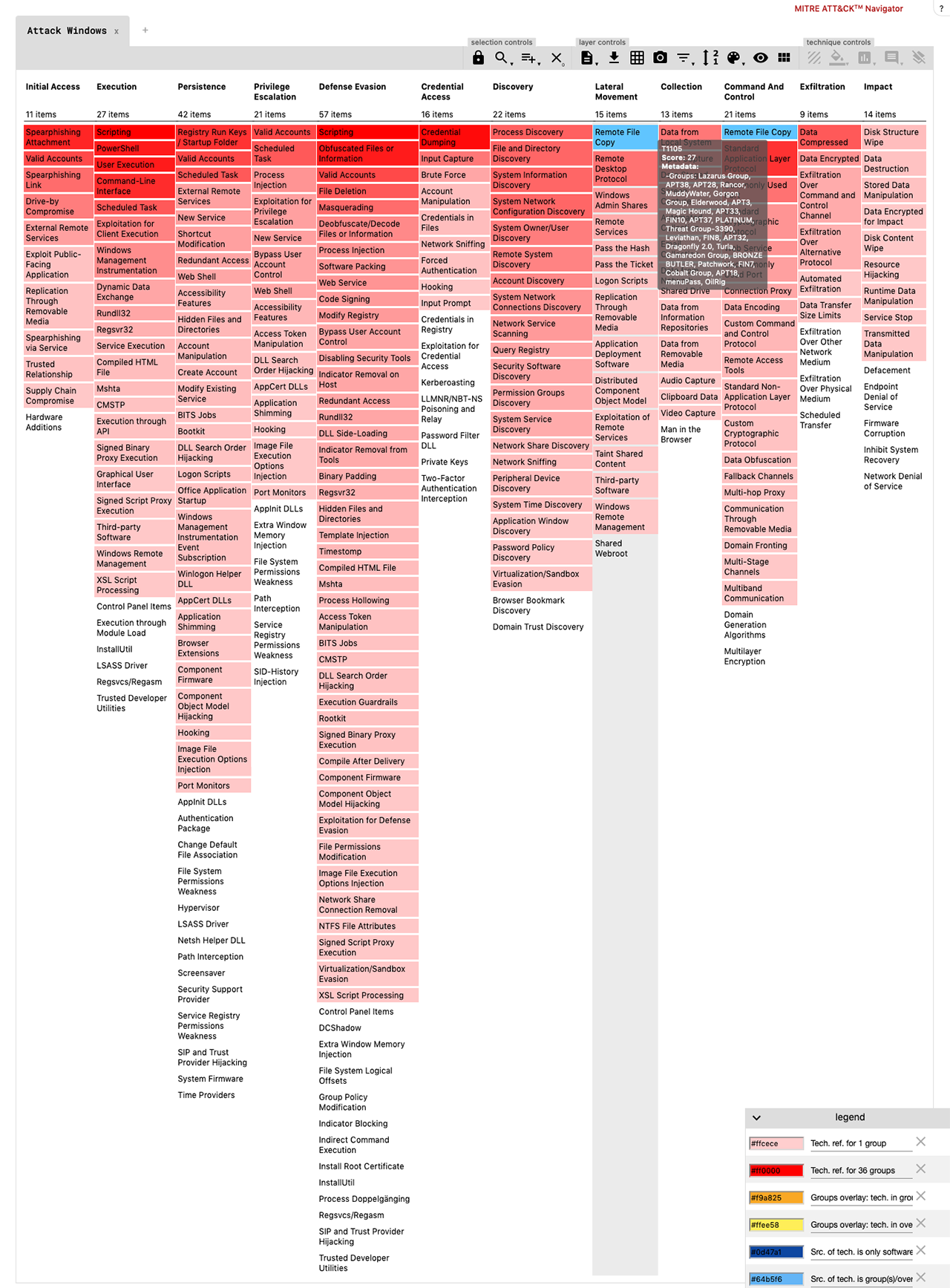 其次,对于企业机构来说,知道威胁主体使用了哪些ATT&CK技术,这一点也至关重要。组织机构可以根据MITRE ATT&CK知识库中存在的威胁组织和恶意软件创建热力图。将威胁组织使用的技术与企业的检测或可见性水平进行比较,确定哪些方面可能存在差距,需要改进,从而增强检测和事件响应能力。下图显示了一个基于ATT&CK中所有威胁组织数据的热力图。热力图中的颜色越深,则表示攻击组织使用该技术的频率就越高。