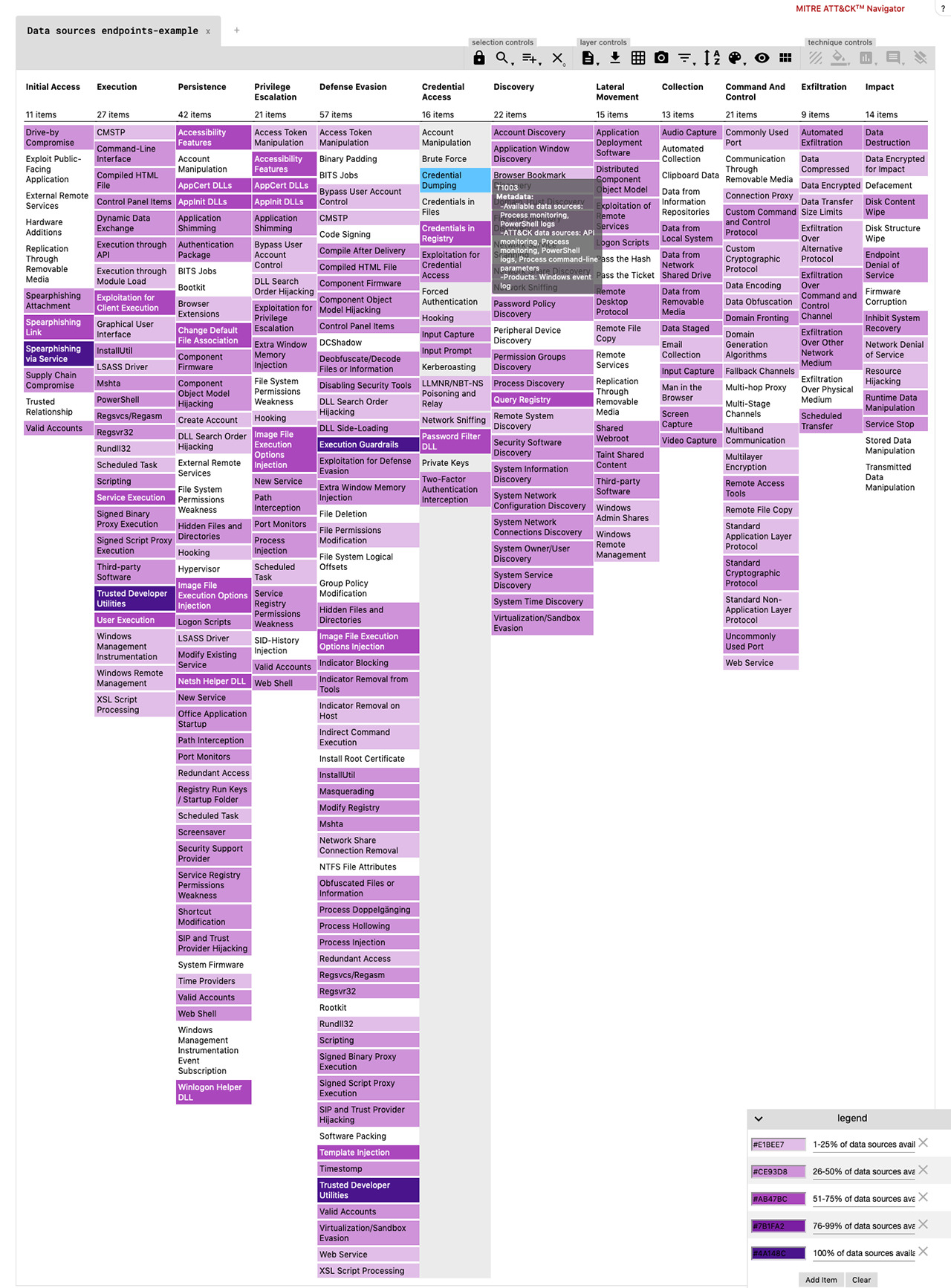 使用ATT&CK框架来提升检测能力的首要步骤就是对数据源进行盘点。ATT&CK框架已定义了大约50种不同类型的数据源。对于每个数据源,企业需要对数据质量、数量内容等方面进行管理。可以使用MITRE ATT&CK导航工具,按下图所示方式将数据源映射到ATT&CK技术,进行可视化展示。