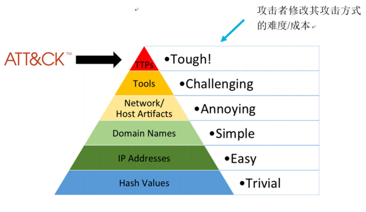 ATT&CK框架核心就是以矩阵形式展现的TTPs,即Tactics, Techniques and Procedures(战术、技术及步骤),是指攻击者从踩点到获取数据以及这一过程中的每一步是“如何”完成任务的。因此,TTPs也是痛苦金字塔中对防御最有价值的一类IoC。当然这也意味着收集TTPs,并将其应用到网络防御中的难度系数是最高的。而ATT&CK则是有效分析攻击者行为(即TTPs)的威胁分析框架。