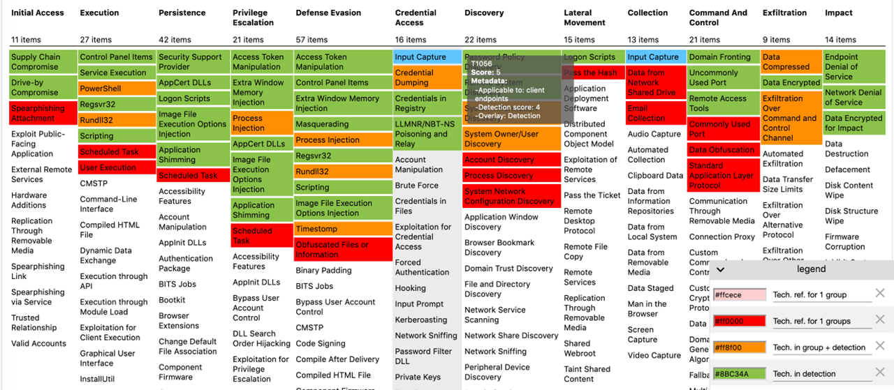 例如,某些ATT&CK技术与自身组织机构相关。那么,组织机构就可以将其与当前的检测状态进行直观比较,确定在ATT&CK技术方面可能存在的差距或改进之处。