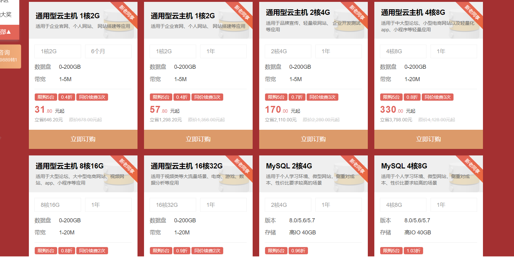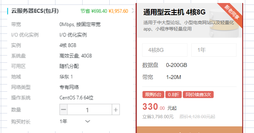 那么这里你可能会问了,大概会优惠多少呢,以4核8G5兆,阿里云和天翼云做下对比: